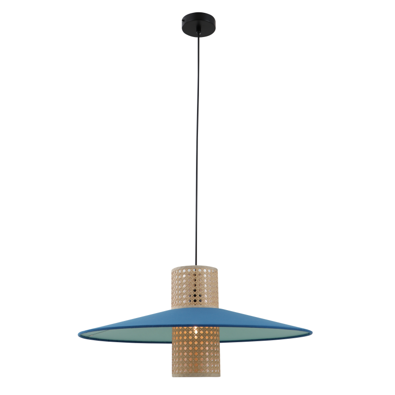 வலுவான விளக்குகளின் தொப்பி வடிவ நெய்த பதக்கத்தில் ஒரு தொப்பி வடிவ துணி நிழல் உள்ளது, இது ஆழமான நீல மற்றும் வான நீல வண்ண-தொகுதி வெளிப்புறத்துடன் வேலைநிறுத்தம் செய்யும். உள் அடுக்கு ஒரு கடினமான நெய்த சிலிண்டரை உள்ளடக்கியது, இது இயற்கை பிரட்டனைப் பிரதிபலிக்கும் வகையில் வடிவமைக்கப்பட்டுள்ளது, இது அதன் வடிவத்தின் மூலம் ஒளியை மென்மையாக பரப்புகிறது -இது ஒரு நிதானமான, கரிம சூழ்நிலையை உருவாக்குவதற்கு இடமாகும்.